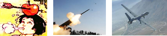 2. Les dimensions spatiale et temporelle de l’autonomie. Trois exemples : la flèche de Guillaume Tell ne vise qu’un point, proche, et à un moment donné ; le missile de croisière va loin et peut adapter sa trajectoire à ce que ses capteurs lui indiquent ; le drone « rôdeur » se voit affecter une zone d’intervention et une durée de mission.