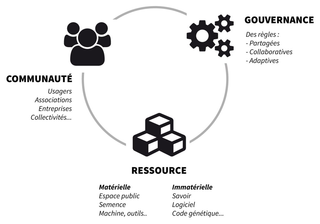 Une série d’articles dans Le Monde (du 29 juillet au 3 août) a fait revivre ce terme, dans différentes domaines : semences paysannes, démocratie locales, vaccins et médicaments, numérique). Le concept est séduisant, généreux. On le trouve bien expliqué dans Assemblée les communs (le bon petit schéma que nous mettons en tête), et après sa triste carrière dans l’Angleterre présindustrielle, remis au goût du jour par Elinor Ostrom. On en trouvera une autre présentation sur Les communs.org .